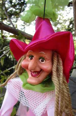 Die liebe Hexe Walli hat nicht nur einen Besen sondern auch einen Korb mit dabei, gekleidet ist sie ganz in verschiedenen rosa Tönen, sehr selten bei Hexen