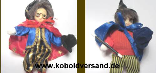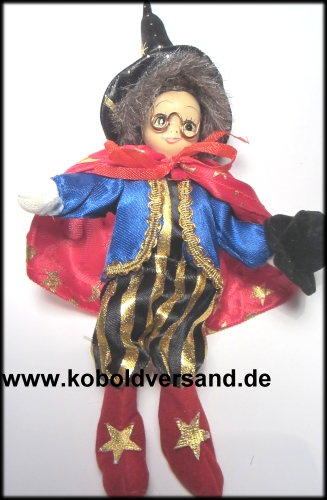 Der kleine Magier hat einen Zylinder in der Hand und ein Bändchen zu aufhängen. Höhe in gestrecktem Zustand 18 cm