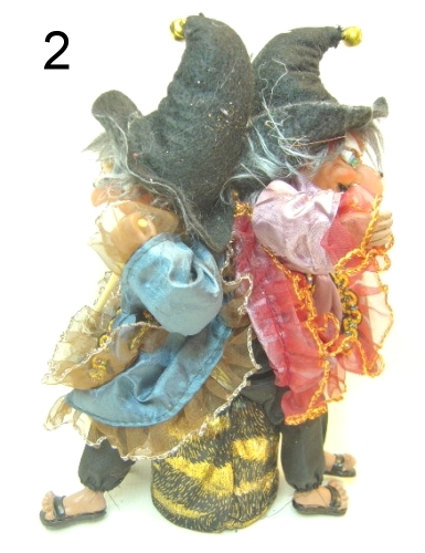 auf zum Hexentanz , wenn man die etwa 21 cm hohen , Rücken an Rücken stehende Hexen einschaltet legen sie eine flotte Sohle aufs Parkett. Bei Erschütterung oder Geräusch fangen sie an zu lachen, die Augen blinken und durch Vibration drehen sie sich im Kreise.