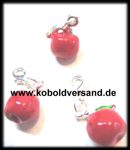 Schöner roter Schneewittchen Apfel als Anhänger für Kette oder Armband mit Karabiner, Material Metall, versilbert, in 3 D gearbeitet,