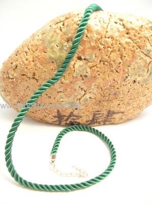 Material Kustfaserkordel weich und glänzend. Stärke etwa 4 mm, Länge etwa 40 cm. Verlängerungskette etwa 4 cm mit Karabinerverschluss.