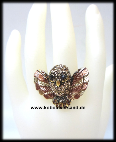 Beeindruckender goldfarbener Strassring mit Eule , Ring dehnbar, passt also auch etwas größeren Fingern