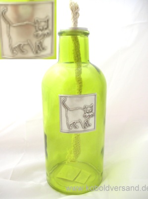 Diese Flasche kann man mit Lampenöl befüllen . Sie ist 22 cm hoch. Vorne befindet sich ein edles Zinnettikett mit einer Hexenkatze,